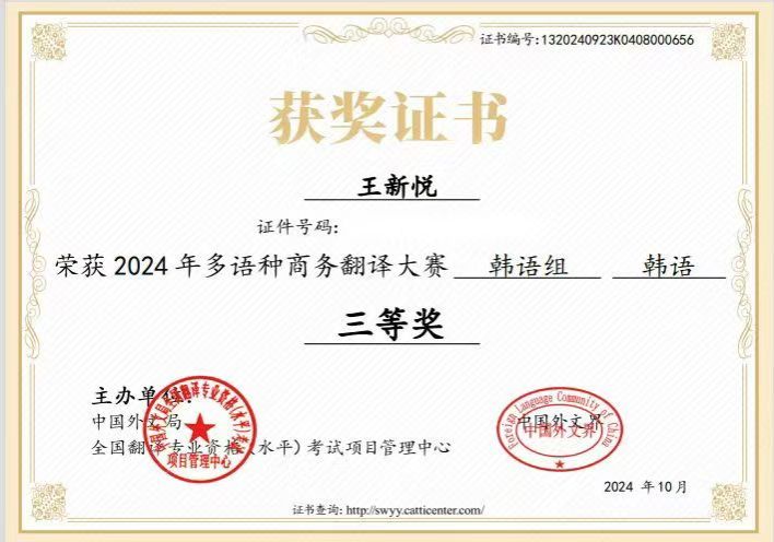 2024年9月28日至9月29日,由中国外文局和全国翻译专业资格水平考试项目管理中心联合主办了2024年全国多语种商务翻译大赛,国产视频 朝鲜语专业2201班的王新悦同学在此次大赛...