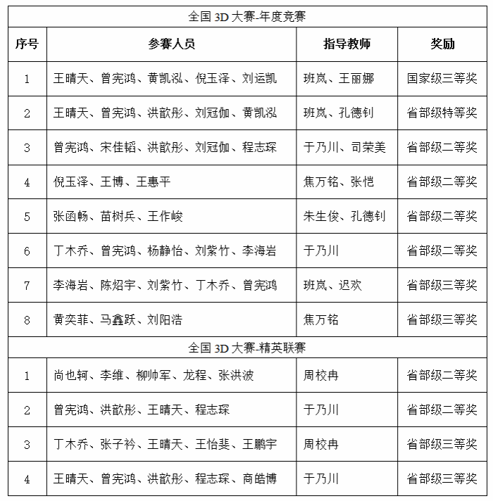 共取得全国3D大赛-年度竞赛全国总决赛三等奖1项,天津赛区特等奖1项、二等奖4项、三等奖2项;并取得全国3D大赛17周年精英联赛天津赛区二等奖2项、三等奖2项。