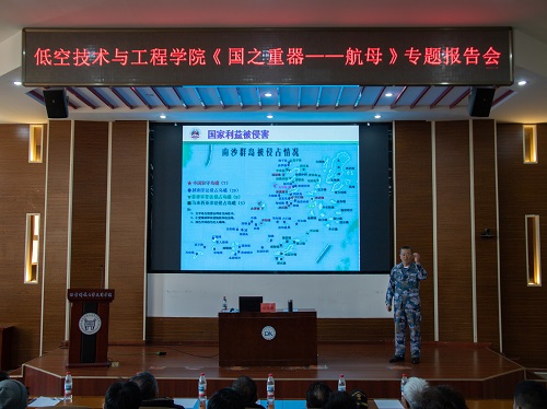 随后,张传勇教授以《国之重器——航母》为题,从“我国为什么发展航母、航母发展的艰难历程、某型舰概况及其军事应用”三个方面,运用大量珍贵影像、翔实数据和生动案例,系统回顾了我国航母事业从零起步到走向深蓝的壮阔征程。当讲到老一辈军工人“干惊天动地事,做隐姓埋名人”的奉献故事时,现场掌声雷动。